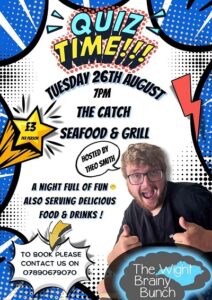 Join us on Tuesday 26th Angust for a Charity Quiz Night in aid of The Wight Brainy Bunch at Catch – Seafood & Grill, hosted by the fabulous Theo Smith.
