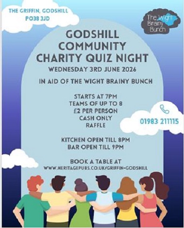 Join us at the Griffin Godshill on Wednesday 3rd June for the Godshill Community Charity Quiz Night in aid of The Wight Brainy Bunch.